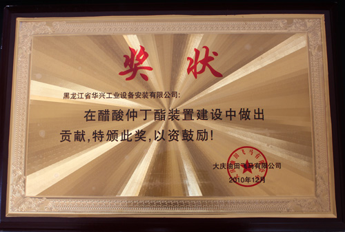 2010.12被大庆油田飞马有限公司授予在醋酸仲丁酯装置建设中做出突出贡献单位。