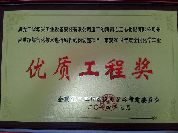 我公司施工的“河南心连心化肥有限公司采用洁净煤气化技术进行原料结构调整项目”荣获全国化工工程建设质量奖评审委员会颁发的2014年度全国化学工业优质工程奖。