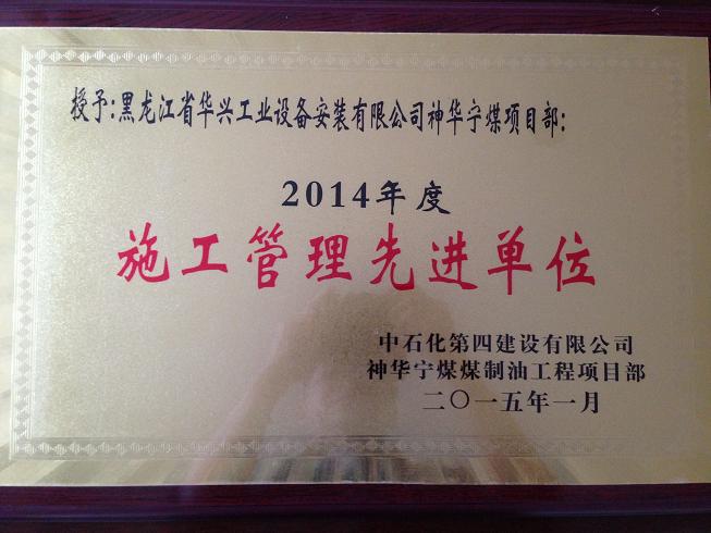 今年一月份,中石化第四建设有限公司授予我公司神华宁煤项目部“施工管理先进单位”。